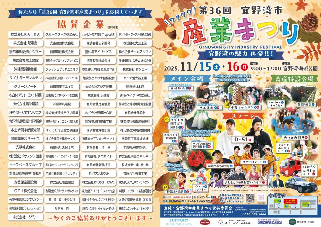 2025年11月15日(土)・16日(日)の2日間、宜野湾海浜公園で「第36回 宜野湾市産業まつり」が開催されます。