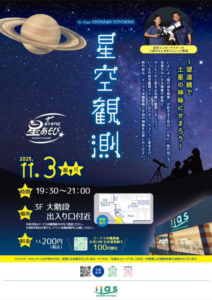 沖縄の秋の夜空をゆっくり見上げながら、土星や星たちの輝きに出会う特別な時間がやってきます。2025年11月3日(祝・月)、イーアス沖縄豊崎で「星空観測」が開催されます。星空エンターテイナーの「星の専門店 星あそび」さんによる解説とともに、望遠鏡を使って実際に星を観察できる体験をお届けします。