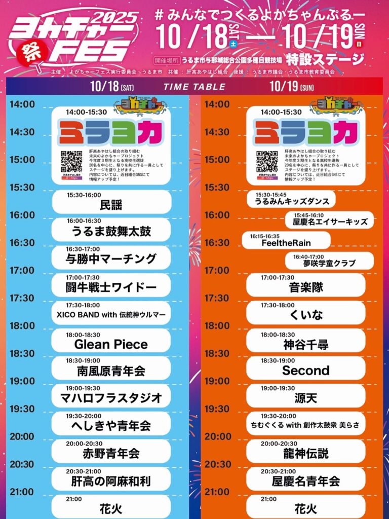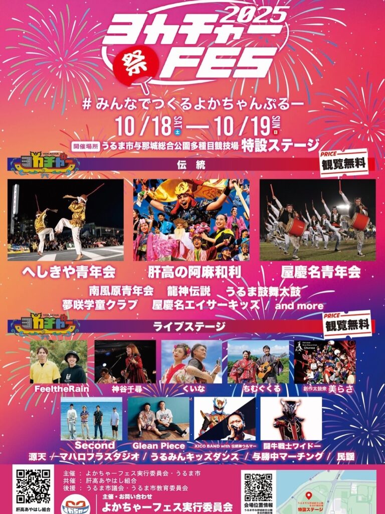 伝統芸能では「肝高の阿麻和利」「屋慶名青年会」などが登場。ライブステージには「FeeltheRain」「神谷千尋」「くいな」「Second」などが名を連ね、若手アーティストのパフォーマンスも楽しみ。夜には打ち上げ花火が空を彩り、祭りのクライマックスを華やかに飾ります。