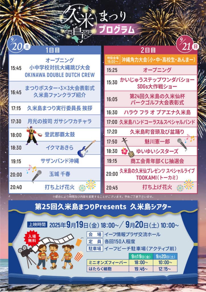 久米島の夏を締めくくる恒例イベント「第25回 久米島まつり」が、2025年9月20日(土)・21日(日)の2日間にわたり、ふれあい公園で開催されます。両日とも午後3時30分からスタートし、夜には打ち上げ花火が予定されています。
