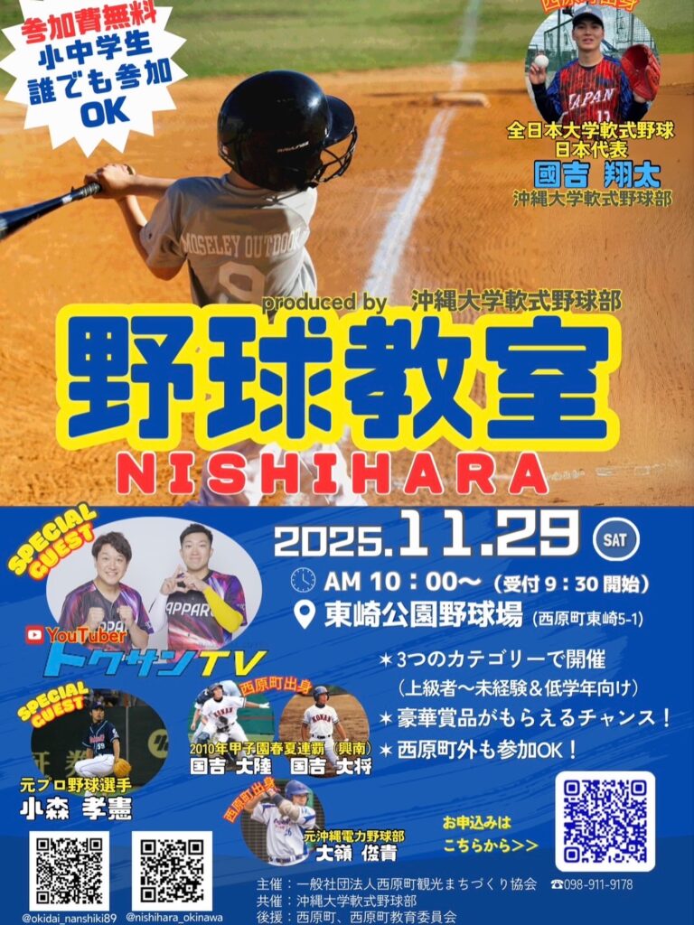 特別ゲストとして、YouTuber「トクサンTV」のメンバーや、元プロ野球選手の小森孝憲さん、西原町出身で甲子園で活躍した国吉大陸さん・国吉大将さん、そして元沖縄電力野球部の大濱俊貴さんも参加予定。憧れの選手たちから直接指導を受けられるチャンスです。
