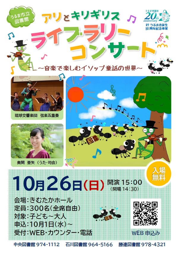 きむたかホール 勝連平安名3071 うるま市 沖縄県 Japanうるま市のきむたかホールで、子どもから大人まで楽しめる「ライブラリーコンサート」~音楽で楽しむイソップ童話(アリとキリギリス)の世界~が開催されます。イソップ童話でおなじみの“アリとキリギリス”をテーマにした特別なコンサ […]